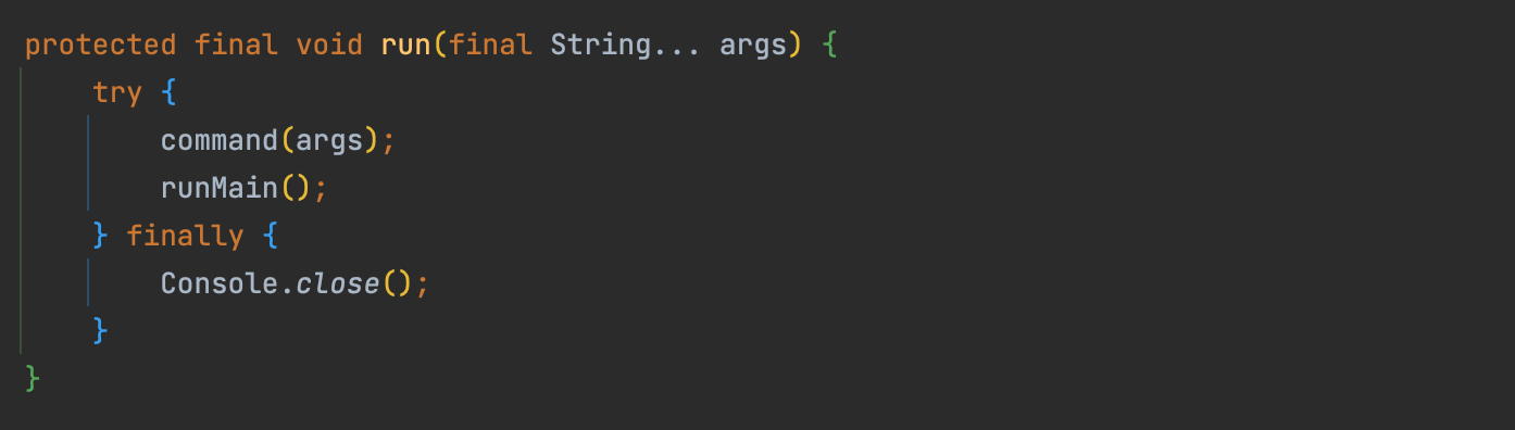 run 메서드에서는 command() 실행 후, runMain() 를 실행합니다.