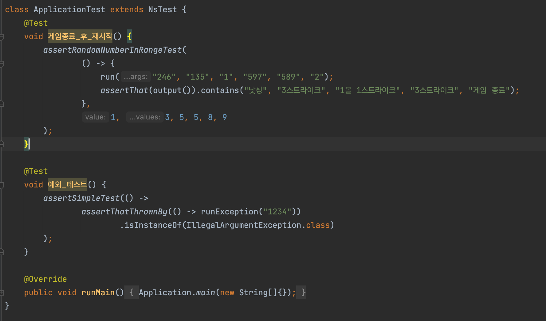 1주 차 숫자야구를 시작하면서 테스트 파일 내부에 NsTest를 확장한 ApplicationTest 가 아래와 같이 예시들이 구현되었습니다.