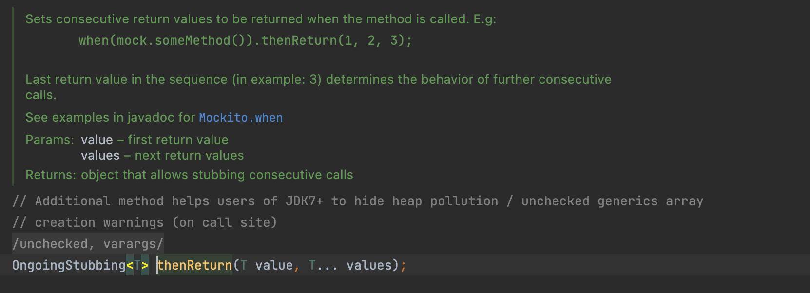 그리고 이어서 thenReturn 을 살펴보면 when 에 건네진 메서드가 실행되었을 때 리턴될 값을 정의해 주는 것을 확인할 수 있고 values 로 넘겨지는 값들을 순서대로 리턴한다고 합니다.