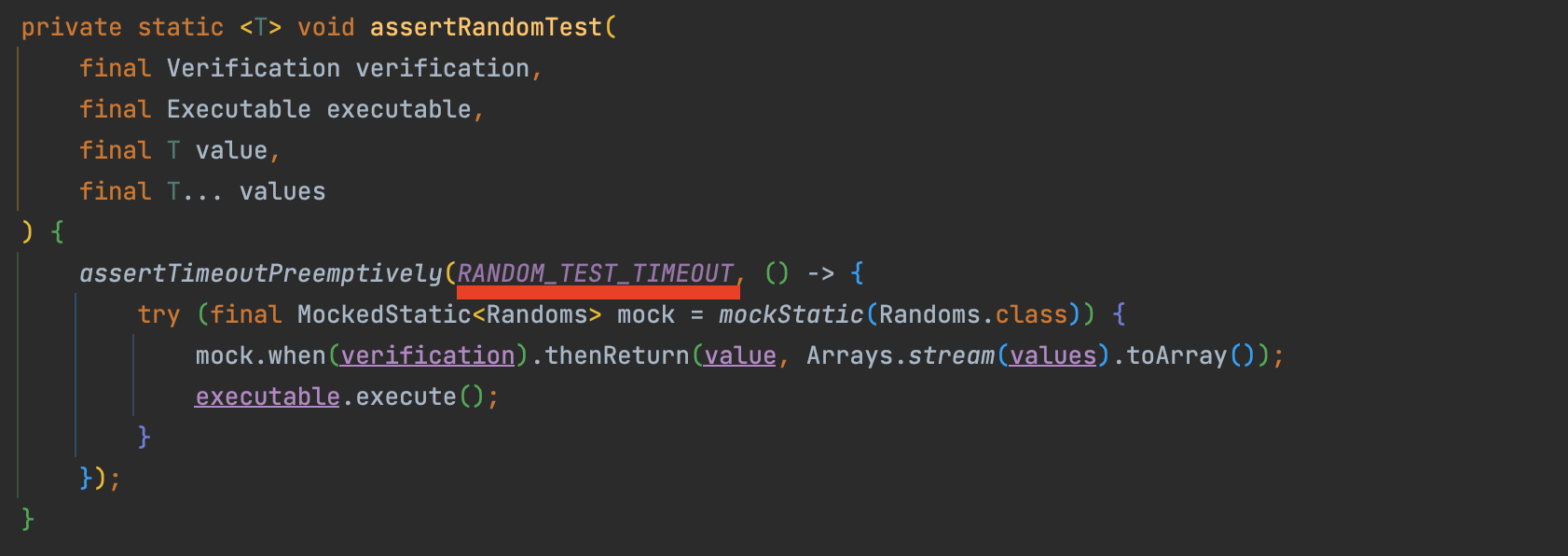 실제로 assertRandomTest 에서 RANDOM_TEST_TIMEOUT 으로 10초라는 시간이 넘겨졌습니다.
