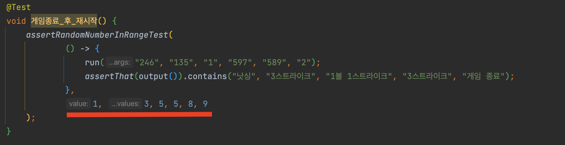 테스트를 확인해 보면 value 로 1, values 로 3, 5, 5, 8, 9 가 건네어지는데 이는 순서대로 Randoms.pickNumberInRange(when에 건네진 메서드)를 실행했을 때 리턴되는 값을 지정한 것입니다.