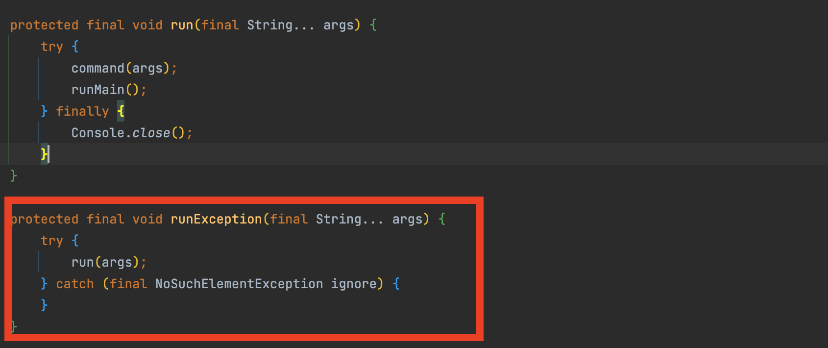 run 을 호출하는데 NoSuchElementException 예외만 잡는 메서드였습니다.