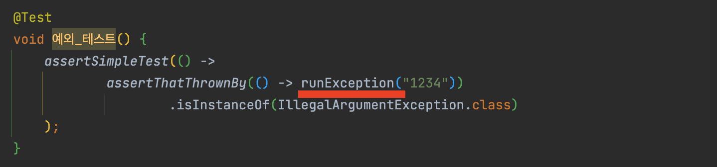 예외 테스트에서 runExcpetion 이라는 메서드를 사용하는데 이에 대해서도 살펴보았습니다.