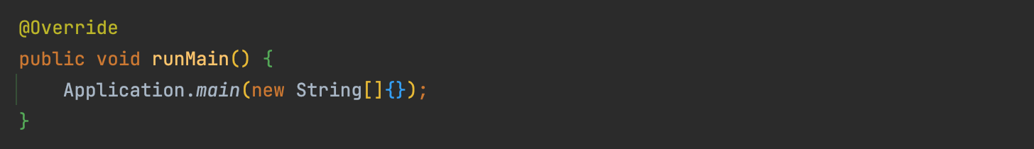 ApplicationTest에서는 위와 같이 정의되어 있는데 단순히 Application.main 함수(애플리케이션 실행 함수)를 빈 문자열 배열과 함께 넘겨주어서 실행합니다.