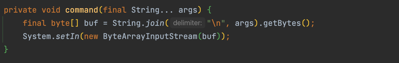 args 로 받은 문자열을 개행(\n)으로 붙이고 바이트 배열로 바꿔 입력 스트림으로 보내는 역할을 합니다.