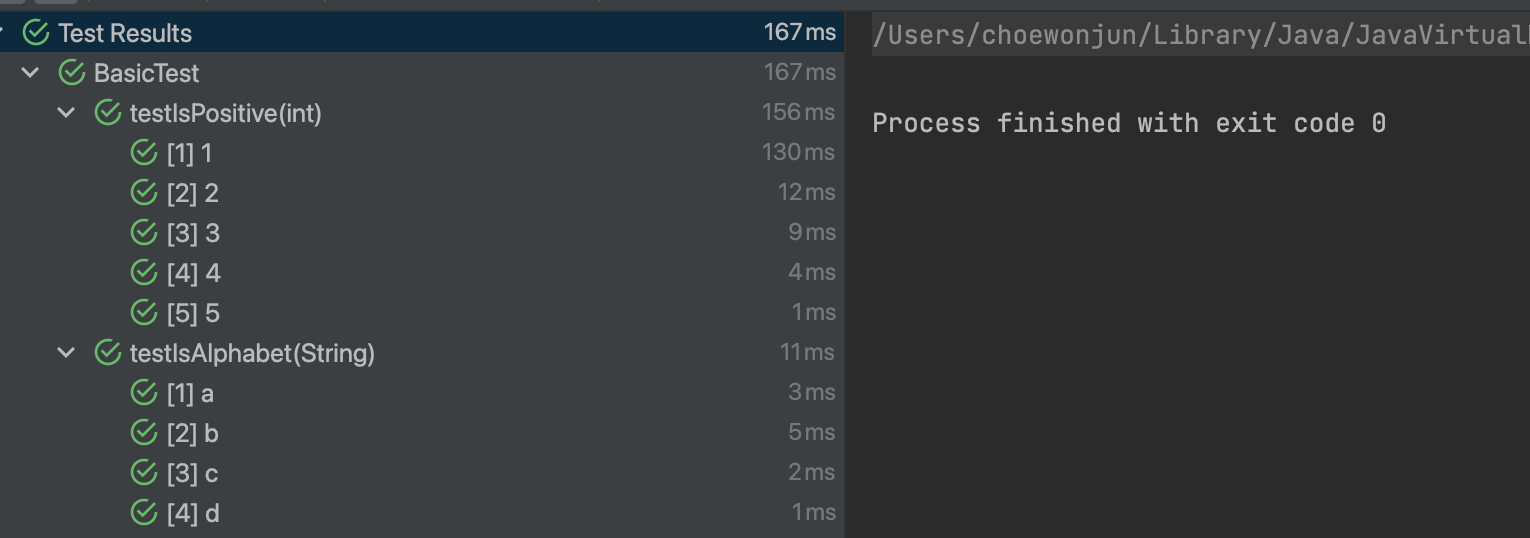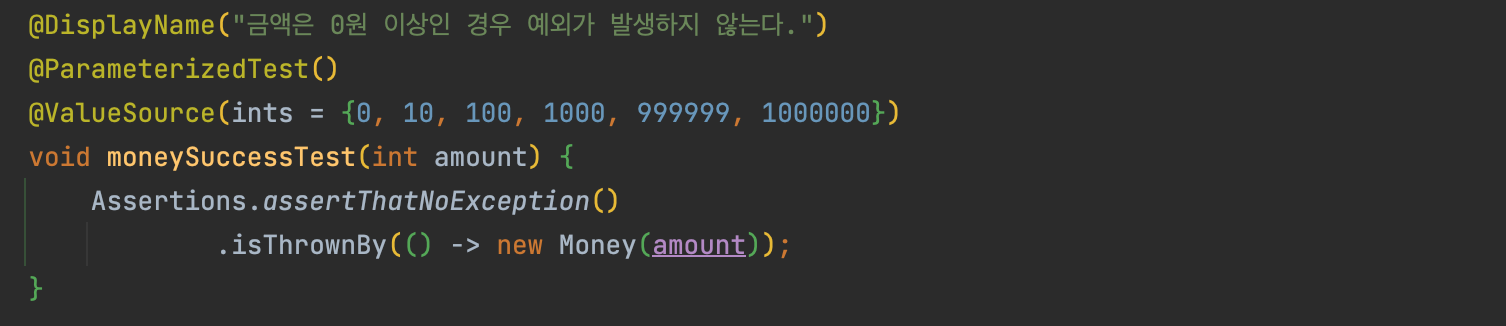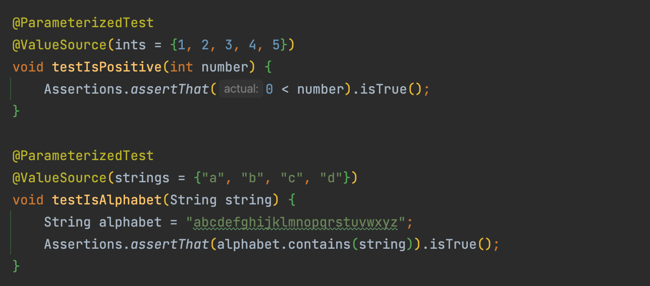 @ValueSource의 소괄호()안에ints,strings,bytes등등 어떤 타입을 사용할 것인지 선언해 준 다음에 사용할 테스트들을 중괄호{}로 건네주면 된다.- 리터럴 값만 테스트할 수 있다.
