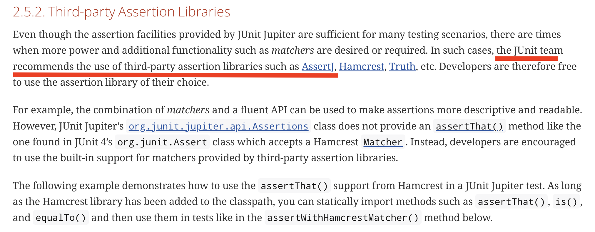 심지어 JUnit5 공식 문서에서 까지 서드 파티 라이브러리인 AssertJ 의 사용을 권장하고 있다.