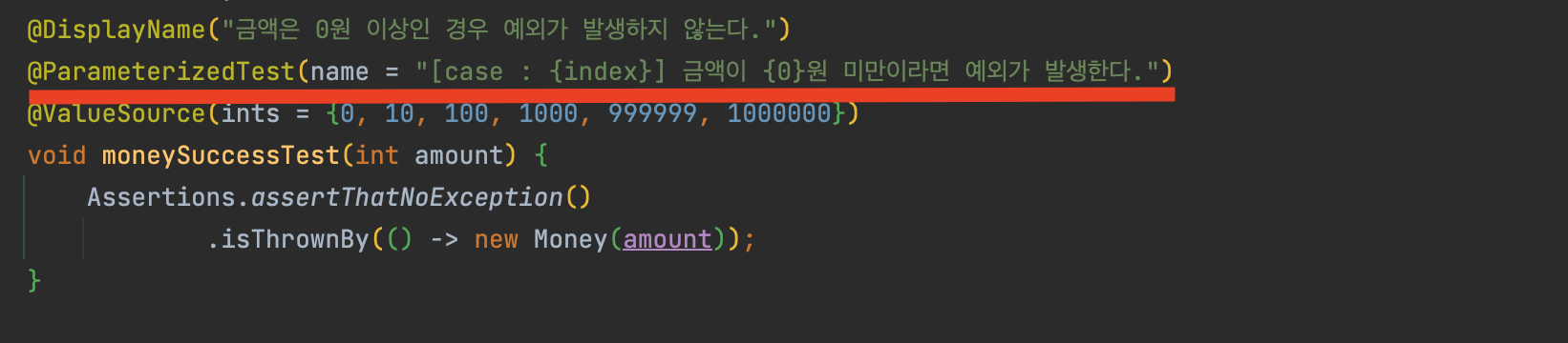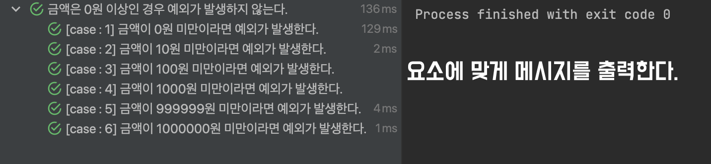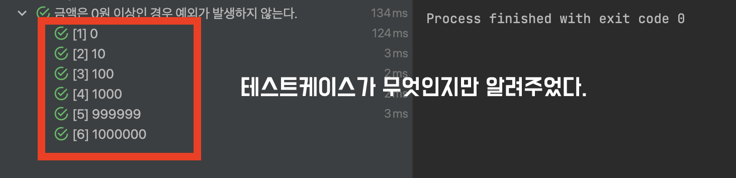 그런데 @ParameterizedTest 안에 메시지를 넣어주면 케이스에 맞는 메시지를 출력해 줄 수 있다.