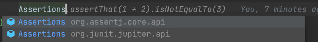 IntelliJ에서 테스트코드를 작성할 때, Assertions 키워드를 작성하면 자동완성 기능으로 두 가지를 추천해준다. 하나는 org.junit.jupiter.api.Assertions이고, 하나는 org.assertj.core.api.Assertions이다. 강의를 듣