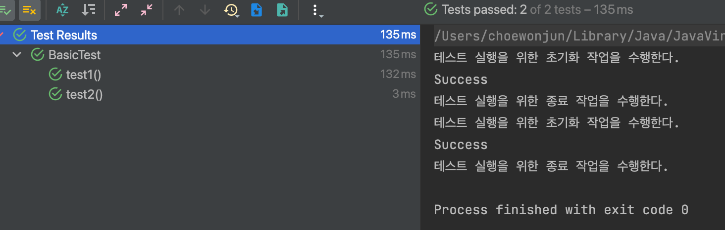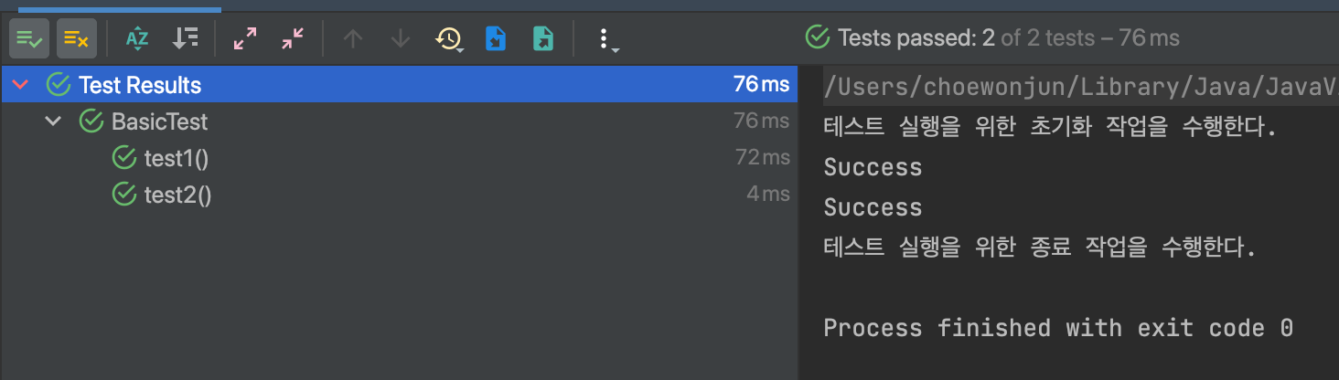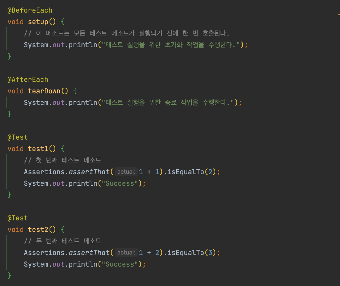 @BeforeEach는 모든 테스트 실행 전에 실행할 메서드를 지정해 준다.@BeforeEach가 붙은 메서드는 각각의 테스트가 실행되기 이전에 호출된다.@AfterEach도 있는데, 이 애노테이션이 붙은 메서드는 각각의 테스트가 실행된 이후에 호출된다.
