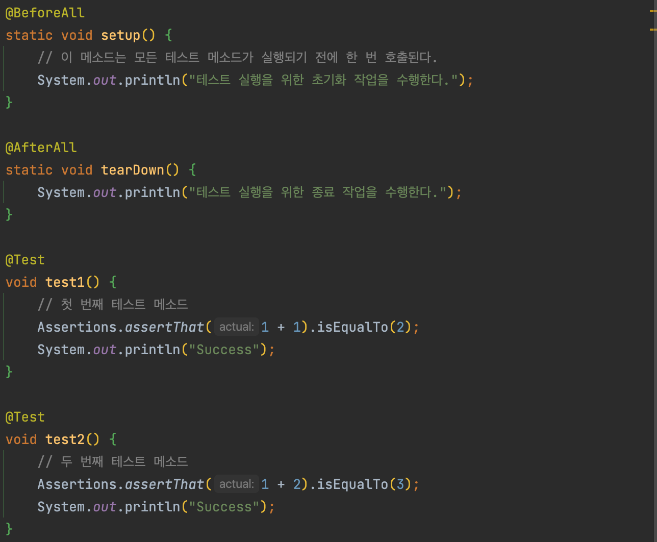 @BeforeAll은 현재 클래스 실행 전 제일 먼저 실행할 메서드를 지정해 준다.- 모든 테스트가 실행되기 이전에 한 번 실행된다. 해당 메서드는