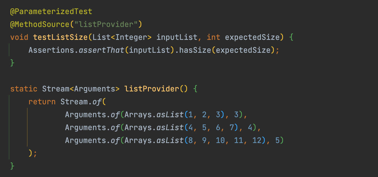 Stream<Arguments>로 넘겨준다. 그 후@MethodSource애노테이션 괄호 안에 해당 메서드 이름을 넣어주면 된다. - 리터럴값뿐만 아니라 List 와 같은 객체도 넘겨줄 수 있다.