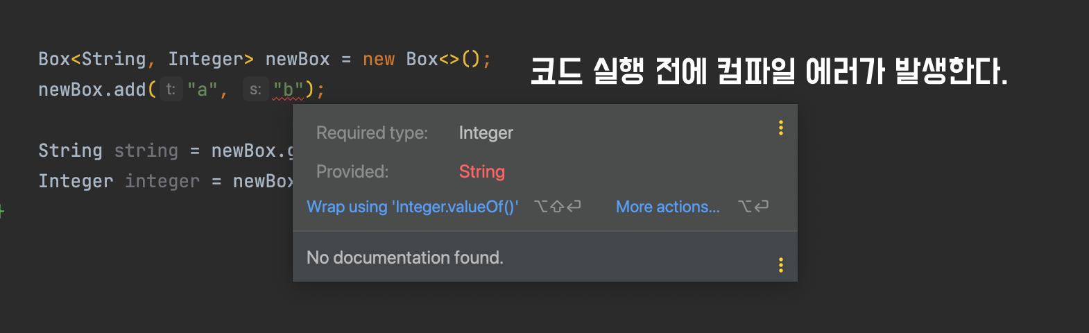 그런데 제네릭을 사용하면 코드를 실행하기 전부터 빨간 줄로 문제가 있다는 것을 알려준다.
