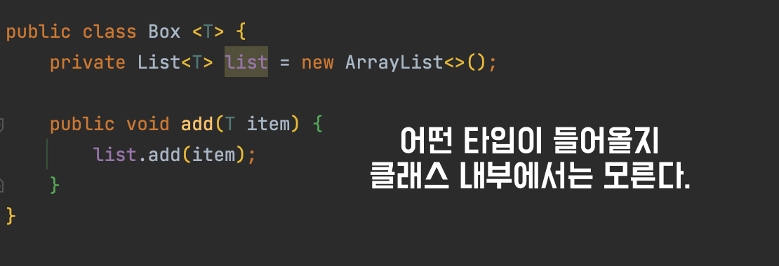 위 사진을 보면 클래스 선언 시 public class Box <T> 와 같이 선언한 것을 볼 수 있다.