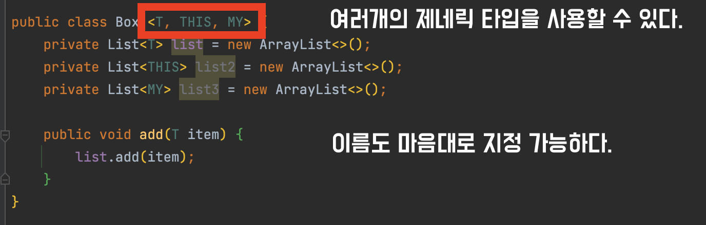 앞서, 제네릭 타입의 이름을 마음대로 지정해 줄 수 있다고 했었다.