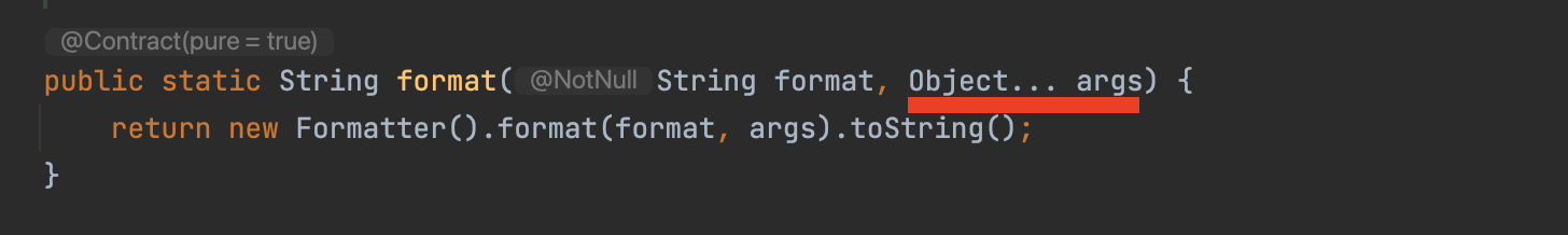 실제로 String.format 정의 부분을 확인해보면 아래와 같이 가변인자를 활용한 것을 볼 수 있다.