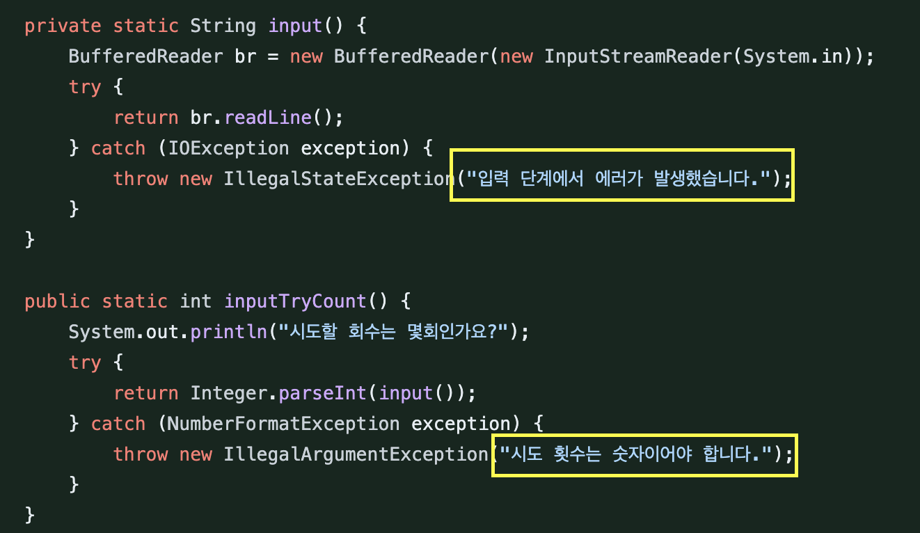 미션을 진행하는 중에는 "일단 메시지를 직접 넣어주고 나중에 리팩터링하자" 라는 생각에 위와 같이 일단 예외 메시지를 직접 넣어주었다.