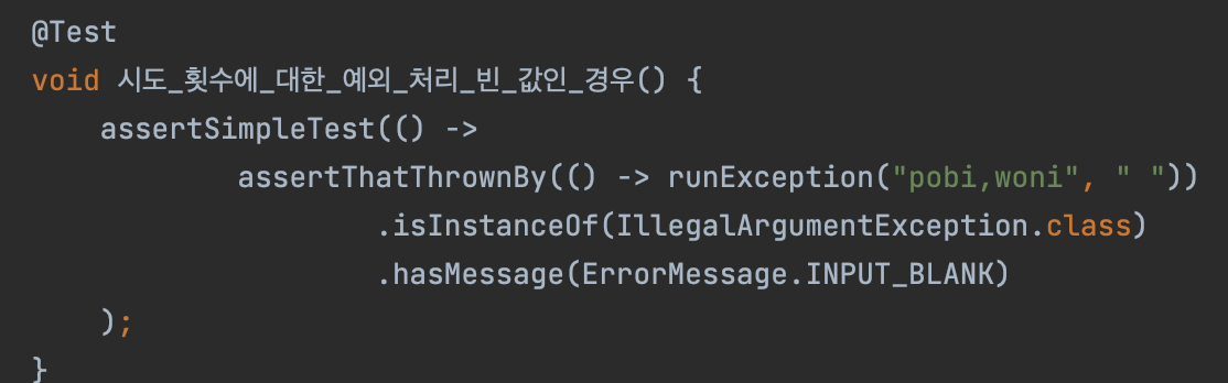 위에서 `hasMessage` 메서드를 활용해서 예외 메시지에 대한 테스트도 같이 해줄 수 있는 장점이 있다.