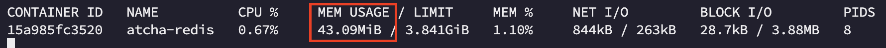 이를 위해 Docker 환경에서 Redis를 실행한 후, 초기 상태에서 약 216개의 데이터를 저장하고 메모리 사용량을 측정했다.