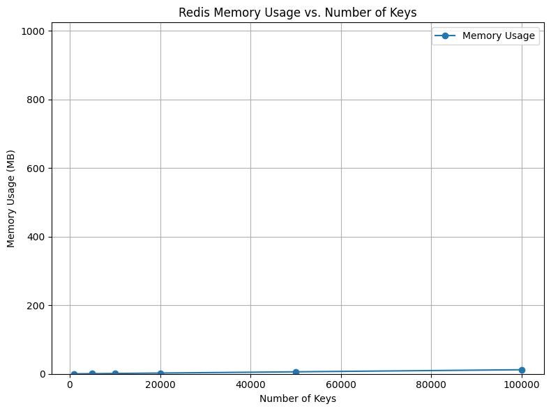 이를 기반으로 그래프도 그려보았다. Y축은 메모리 사용량이고 X축은 키 개수이다.
