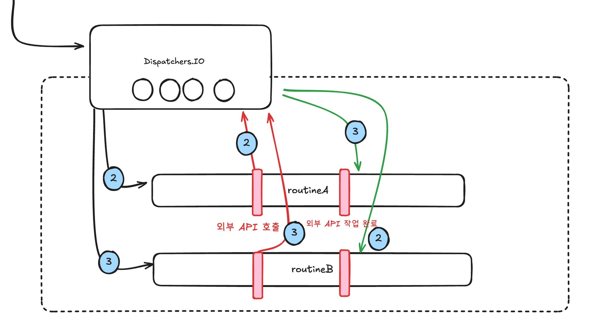 routineA와 routineB는 각기 스레드 풀에서 사용 가능한 워커 스레드를 배정받아 작업을 수행하게 된다. 그러다가 외부 API를 호출하게 되면 suspend가 일어나게 되고 코루틴은 해당 작업이 오래 걸리니 쓰레드를 반납하게 된다. 즉, 중단(suspend)이 일어나는 것이다.