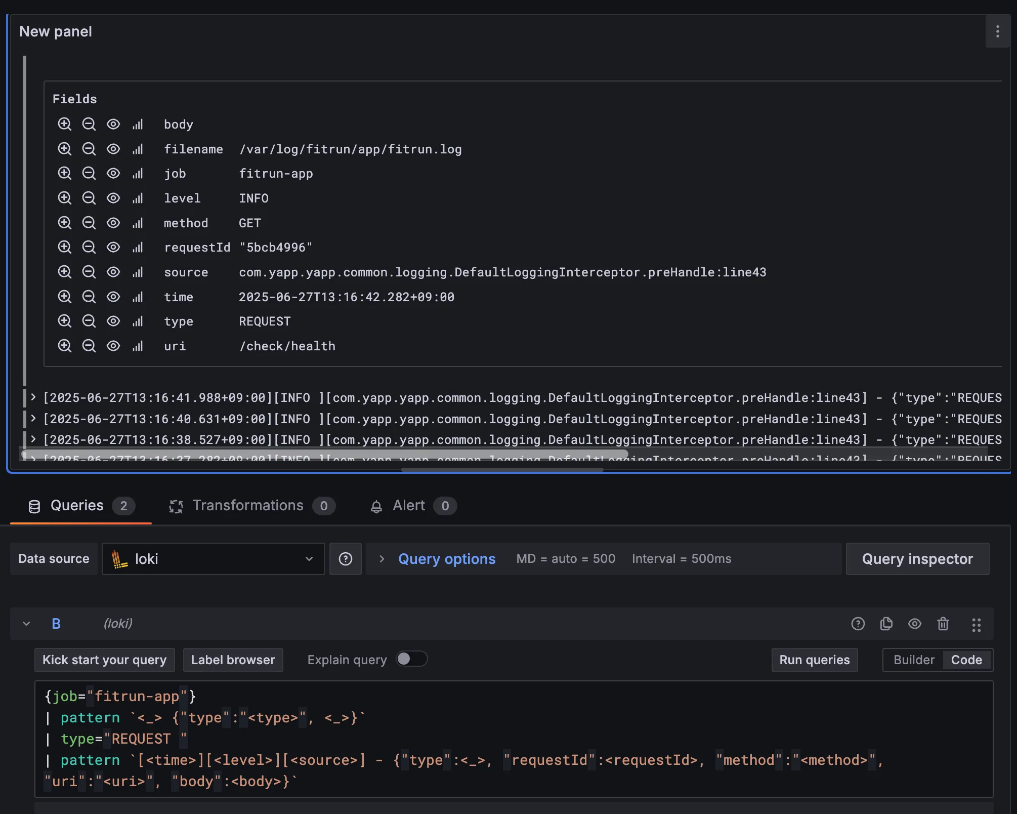 Loki에서는 정규표현식, json등 여러가지 방식으로 로그를 파싱할 수 있습니다. 저는 Pattern이라는 방식으로 로그를 파싱했습니다.